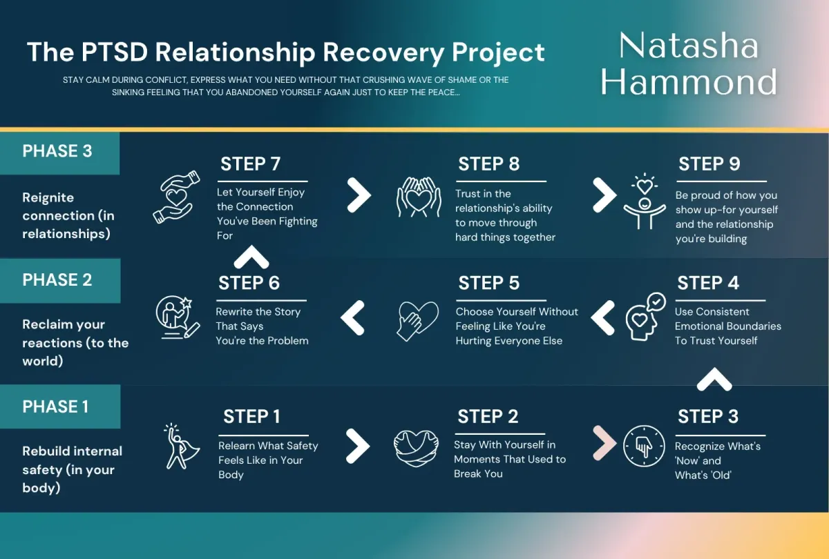 Each phase is designed to help you rebuild the self trust, emotional clarity, and relational steadiness that trauma has disrupted.